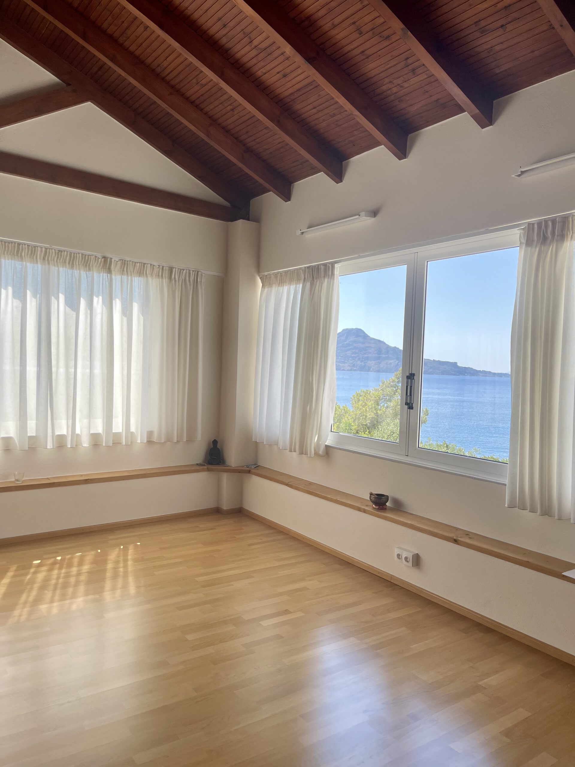 Es gibt einen wunderschönen großen Gruppenraum mit Blick aufs Mittelmeer, der ideal für Körper- und Bewegungsarbeit ist. Yoga findet auf einem überdachten Freiplatz ähnlich einem Amphitheater draußen statt, auch mit Blick aufs Meer.